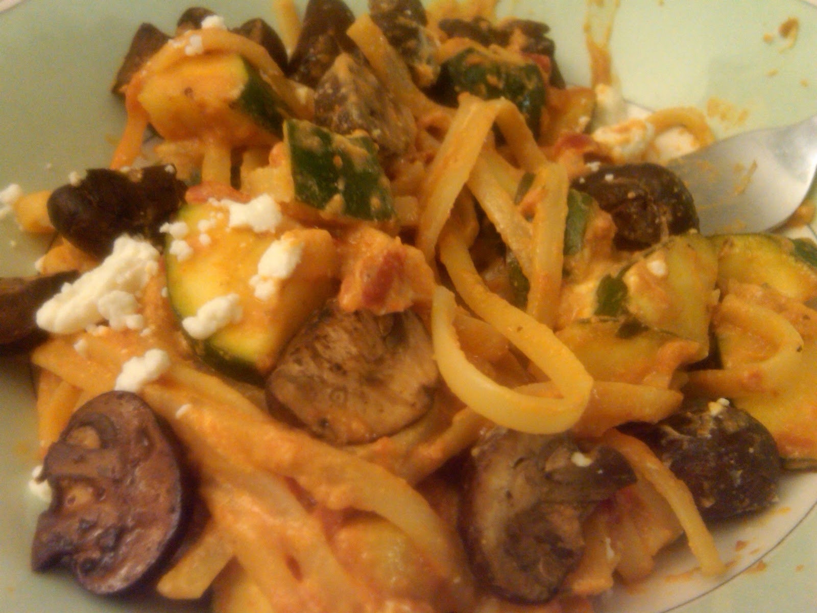 I love pasta with cream sauce, but while I don't mind buying jarred marinara sauce, I find jarred cream-based sauces kind of icky. There's something about dairy hanging out on a shelf. Gross. I wanted to make something delicious and rich for dinner tonight (it was one of those days) but didn't have any of the ingredients for an alfredo or other creamy sauce so I improvised. I had a container of goat cheese in my fridge and some roasted red pepper arrabiata sauce (kind of like spicy marinara sauce) and thought that maybe I could mix up the goat cheese and marinara and make a faux-vodka sauce with a bit of tang. Luckily, it somehow worked out and not only wasn't it not disgusting--it was GOOD...like so good I kept getting up to refill my bowl while I watched re-runs that all of a sudden I was SO FULL. With no good reason other than...goat cheese marinara covered linguine with sweet baby bella mushrooms and fresh zucchini.